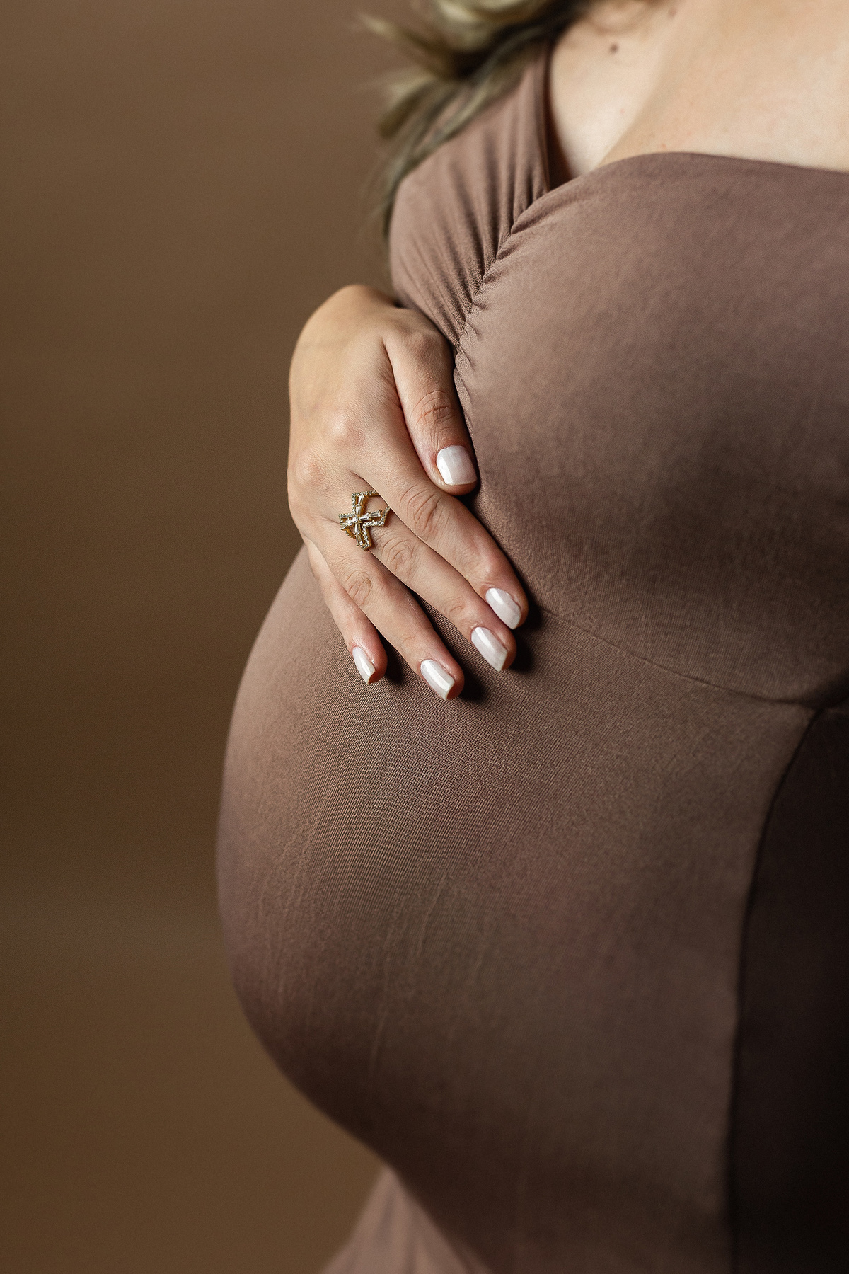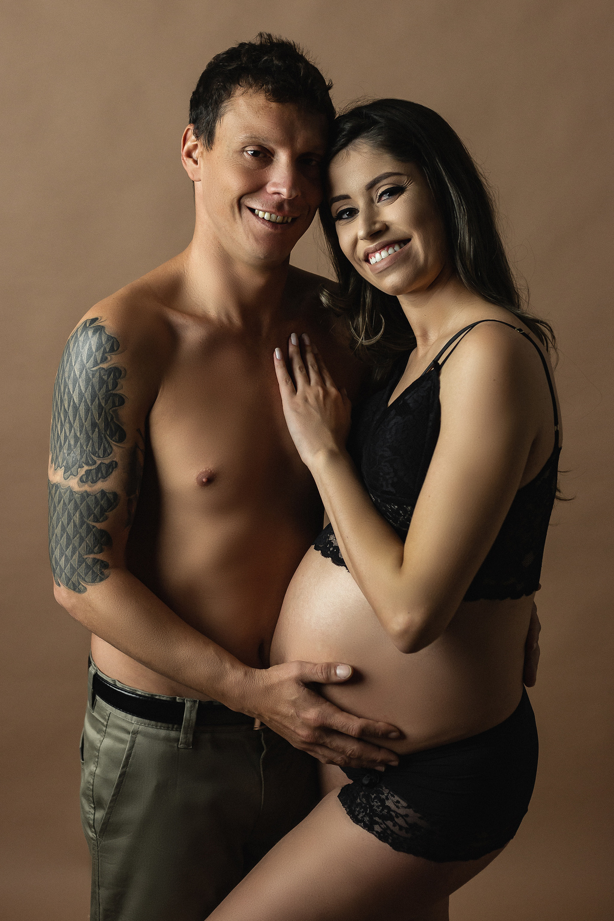 O sorriso sincero estampado no rosto da mamãe Karina em seu ensaio gestante aqui no estúdio.