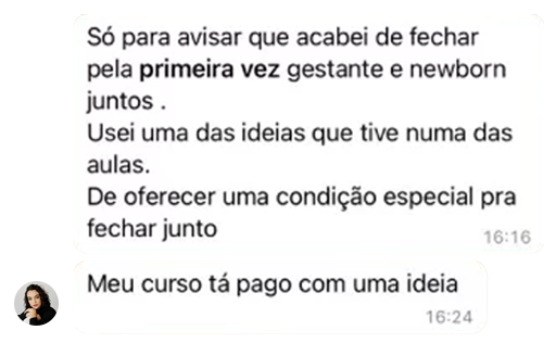 Como se não bastasse, ainda temos aulas de edição, materiais didáticos complementares e módulos que te auxiliarão a montar seu estúdio e até entender melhor o público de maternidade.